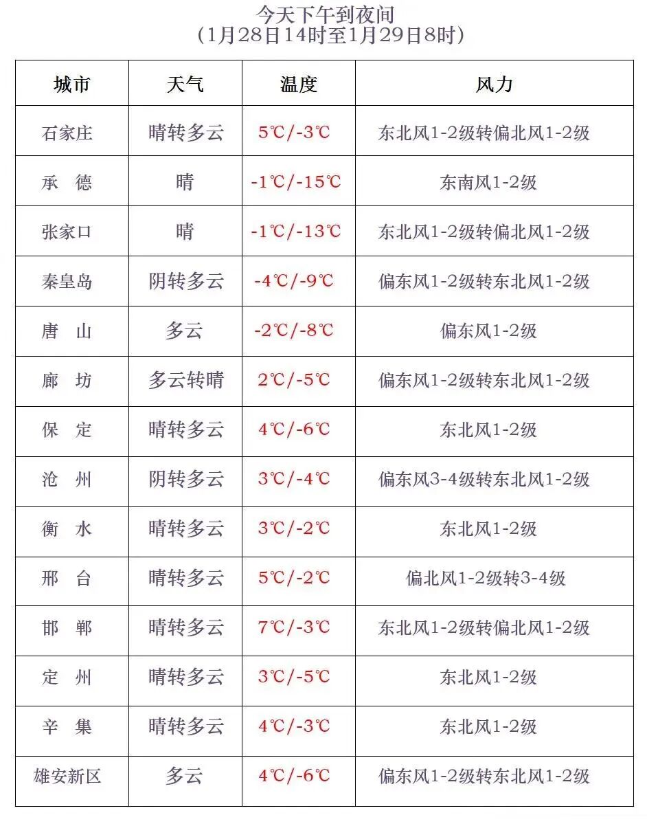 今天下午到夜间,唐山、秦皇岛、廊坊、沧州阴天间多云,邢台西部、邯郸西部晴转多云,其他地区晴间多云。