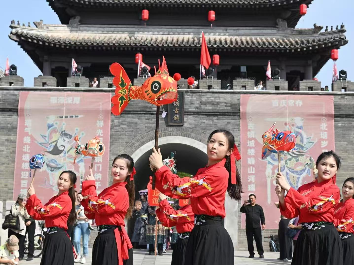 上午十点四十,城门外的非遗表演“北塘飞镲”和“十面鼓”率先登场。演员们身着彩衣,手中铜镲翻飞、鼓点铿锵,热烈的节奏把节日气氛推向高潮。“飞镲特别震撼,感觉整个人都被那种节奏带动了。”来自天津市区的游客李女士笑着说,“孩子也看得特别起劲,拍了好多视频。”