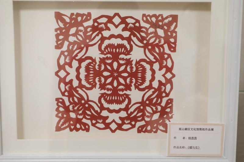 展厅现场,8岁女孩杨茜茜的剪纸作品《蝶与花》引来阵阵赞叹。作品构图饱满,蝴蝶翅膀的纹路细腻入微,花瓣形态栩栩如生,传统技艺与孩童创意在此实现了完美融合。面对赞誉,杨茜茜十分谦虚,她说:“我好朋友的作品才棒呢!她剪的《燕舞祥韵》特别好看,我带你们去看看!”话音未落,她便主动化身“小小讲解员”,带着几位观众走向好友的作品,熟练地介绍起来。