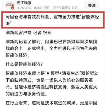 看了阿里新财年的首次集团战略会,有一个事得到了高度重视,那就是阿里要全力推进以千问为代表的“智能体经济”,我觉这背后很不简单。